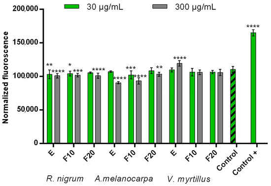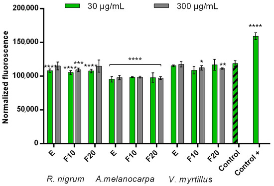 Intracellular ROS levels in BJ cells exposed to extracts (E) and ferments (F10 and F20) from R. nigrum, A. melanocarpa, and V. myrtillus. Data are the mean of three independent experiments in which each sample concentration was performed in triplicate. **** p < 0.0001, *** p < 0.001, ** p < 0.01, and * p < 0.05 compared to the control.