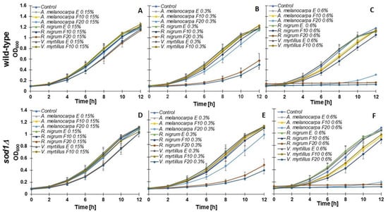 Growth kinetics of the wild-type yeast BY4741 (A–C) and the isogenic mutant sod1Δ (D–F) treated with extracts and ferments (F10 and F20) of R. nigrum, A. melanocarpa, and V. myrtillus. The optical density (OD600) of the culture was measured for 12 h at different points. The data presented are replicates from two independent cultures ± SD, which are smaller or equal in size to the symbol size.
