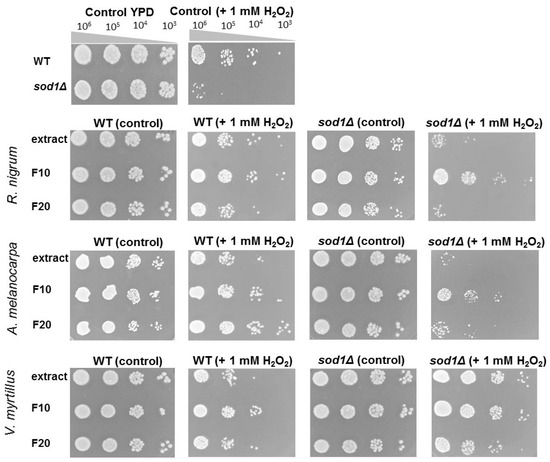Spot plate assay of the wild-type BY4741 strain (WT) and isogenic mutant sod1Δ (sod1Δ) treated with extracts and ferments (F10 and F20) of R. nigrum, A. melanocarpa, and V. myrtillus and additionally treated with 1 mM hydrogen peroxide for 1 h (WT+ 1 mM H2O2 and sod1Δ + 1 mM H2O2). Strains were serially diluted (as indicated (106 to 103). Each spot assay was performed in triplicate.