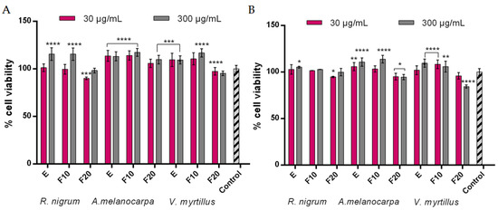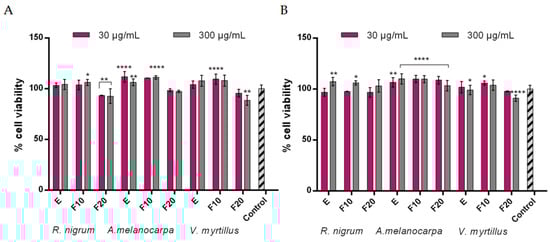 Effect of R. nigrum, A. melanocarpa, and V. myrtillus extracts and ferments (at the concentration of 30 and 300 μg/mL) on Alamar Blue assay (A) and neutral red dye uptake (B) in cultured keratinocytes (HaCaT) after 24 h of exposure. Data are the mean ± SD of three independent experiments, each consisting of three replicates per test group; **** p < 0.0001, ** p< 0.01, and * p < 0.05 compared to the control.