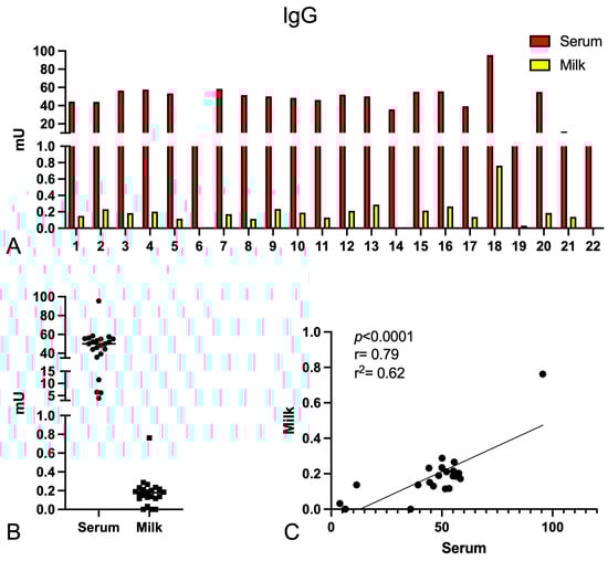 - Romero Ramirez, D.S.; Lara Perez, M.M.; Carretero Perez, M.; Suarez Hernandez, M.I.; Martin Pulido, S.; Pera Villacampa, L.; Fernandez Vilar, A.M.; Rivero Falero, M.; Gonzalez Carretero, P.; Reyes Millan, B.; et al. SARS-CoV-2 Antibodies in Breast Milk After Vaccination. Pediatrics 2021, 148, e2021052286. [Google Scholar] [CrossRef]