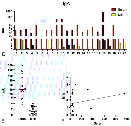 - Scrimin, F.; Campisciano, G.; Comar, M.; Ragazzon, C.; Davanzo, R.; Quadrifoglio, M.; Giangreco, M.; Stabile, G.; Ricci, G. IgG and IgA Antibodies Post SARS-CoV-2 Vaccine in the Breast Milk and Sera of Breastfeeding Women. Vaccines 2022, 10, 125. [Google Scholar] [CrossRef]