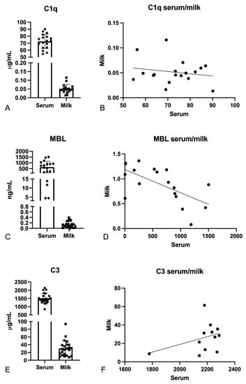2.2. Evaluation of C1q, MBL, and C3 Levels in the Serum and Milk of Vaccinated Mothers