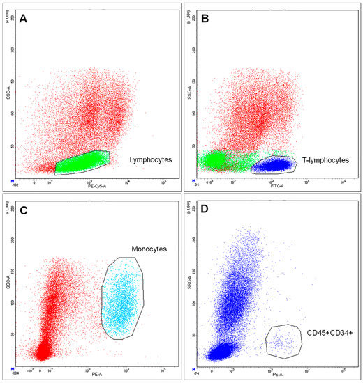 Determination of immune phenotype of umbilical cord blood mononuclear cells. (A) staining for CD45, selected green area–Lymphocytes; (B) staining for CD3, selected dark blue area–T-lymphocytes; (C) staining for CD14, selected blue area–Monocytes; (D) staining for CD34, selected events–CD45+ CD34+ cells.