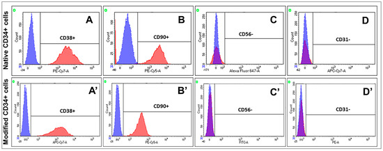 Determination of immune phenotype of CD34 positive cells. (A,A’) staining for CD38+; (B,B’) staining for CD90+; (C,C’) staining for CD56 (D,D’) staining for CD31. Native CD34+ cells—non-treated cells (UCB-MC-NTC). Modified CD34+ cells—cells modified with Ad-VEGF165, Ad-FGF2, and Ad-SDF1α (UCB-MC-VEGF-FGF2-SDF1α). Red peaks—staining with antibodies; blue peaks— negative control (isotype control).
