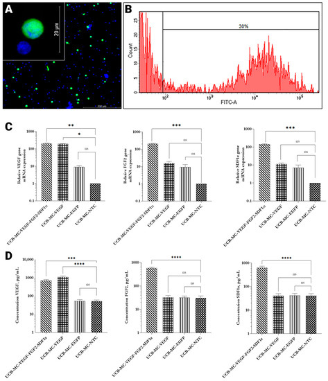 Analysis of transgenes expression in genetically modified UCB-MCs in vitro, 72 h post-transduction (MOI 10). (A) Fluorescent microscopy of EGFP+ cells (green fluorescence). Nuclei were stained with Hoechst 33342 (blue fluorescence). Scale bar 200 µm, 20 µm (inset). (B) Flow cytometry analysis of Ad-EGFP genetically modified UCB-MCs. Approximately 30% of genetically modified UCB-MCs exhibit green fluorescence. (C) Relative expression mRNA of therapeutic genes in genetically modified hUCB-MCs (n = 3). (D) The concentration of secreted proteins VEGF, FGF, and SDF1α in supernatants collected from genetically modified umbilical cord blood mononuclear cells (n = 8). UCB-MC-VEGF-FGF2-SDF1α—umbilical cord blood mononuclear cells modified with Ad-VEGF165, Ad-FGF2, and Ad-SDF1α. UCB-MC-VEGF—umbilical cord blood mononuclear cells modified with AdVEGF165. UCB-MC-EGFP—umbilical cord blood mononuclear cells modified with Ad-EGFP. UCB-MC-NTC—non-treated cells. Data presented as average ± standard error (SE); p < 0.05 * statistically significant differences compared to control (** p < 0.01; *** p < 0.001; **** p < 0.0001 ns—non-significant).