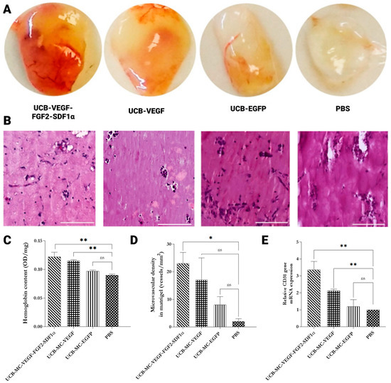 UCB-MC engineered with recombinant adenoviruses promotes angiogenesis in an in vivo Matrigel plug assay. Matrigel plugs collected at one-week post-implantation were appraised. (A) Representative gross morphological assessment and (B) microphotographs of harvested implants’ hematoxylin & eosin (H&E) staining. Scale bar 100 μm. (C) Quantification of hemoglobin concentration in each Matrigel plug (n = 4). (D) Histomorphometric analysis of vascularization process, number of blood vessels in frozen sections of the Matrigel plugs. (E) RT-qPCR quantification of CD31 mRNA in Matrigel plugs. UCB-MC-VEGF-FGF2- SDF1α—umbilical cord blood mononuclear cells modified with Ad-VEGF165, Ad-FGF2, and Ad-SDF1α. UCB-MC-VEGF—umbilical cord blood mononuclear cells modified with Ad-VEGF165. UCB-MC-EGFP—umbilical cord blood mononuclear cells modified with Ad-EGFP. PBS—Matrigel containing PBS. Data presented as average ± standard error (SE); p < 0.05 * statistically significant differences compared to control (n = 3; ** p < 0.01; ns—non-significant).