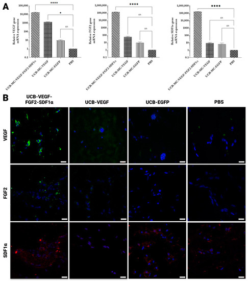 Analysis of transgenes expression in isolated Matrigel plugs one-week post-implantation. (A) Increasing concentrations of VEGF, FGF2, and SDF1α mRNA levels in Matrigel plugs. RT-qPCR analysis was performed on the total RNA extracted from gelled Matrigel samples. (B) Immunohistochemical analysis of Matrigel plugs. Staining for VEGF (green), FGF2 (green), and SDF1α (red). Nuclei were counterstained using a DAPI solution (4′,6-diamidino-2-phenylindole) (blue). Scale bars 50 µm. UCB-MC-VEGF-FGF2-SDF1—umbilical cord blood mononuclear cells modified with Ad-VEGF165, Ad-FGF2, and Ad-SDF1α. UCB-MC-VEGF—umbilical cord blood mononuclear cells modified with Ad-VEGF165. UCB-MC-EGFP—umbilical cord blood mononuclear cells modified with Ad-EGFP. PBS—Matrigel containing PBS. Data presented as average ± standard error (SE); p < 0.05 * statistically significant differences compared to control (n = 3; **** p < 0.0001; ns—non-significant.