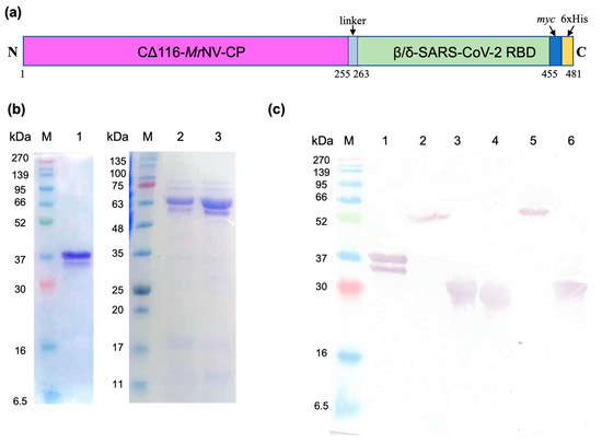 SDS-PAGE and Western blot analysis of the recombinant proteins. (a) A schematic representation of β- or δ-SARS-CoV-2 RBDs fused to the C-terminus of the protruding (P) domain truncated-MrNV-CP (CΔ116-MrNV-CP). The myc epitope and a 6xHis-tag at the C-terminal region are labeled. The positions of the amino acid residues of each domain are numbered. (b) SDS-PAGE analysis of purified (lane 1) CΔ116-MrNV-CP with a molecular mass of ~33 kDa, (lane 2) β-SARS-CoV-2 RBD fused to the C-terminus of CΔ116-MrNV-CP (CΔ116-MrNV-CPβ-RBD), and (lane 3) δ-SARS-CoV-2 RBD fused to the C-terminus of CΔ116-MrNV-CP (CΔ116-MrNV-CPδ-RBD). Lanes 2 and 3 show that the molecular mass of the purified protein is ~55 kDa. Purified proteins were then analyzed with Western blotting. Lanes 1 to 6 in (c) show that CΔ116-MrNV-CP, CΔ116-MrNV-CPβ-RBD, β-RBD alone, Wu-RBD alone, CΔ116-MrNV-CPδ-RBD, and δ-RBD alone, respectively, were detected by the anti-His monoclonal antibody. Protein markers in kilo Dalton (kDa) are indicated on the gels and blot.