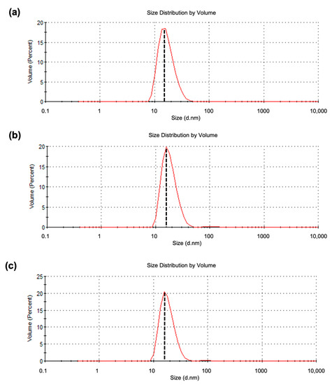 DLS analysis indicated that the average particulate sizes of the VLPs formed by CΔ116-MrNV-CP (Figure 3a), CΔ116-MrNV-CPβ-RBD (Figure 3b), and CΔ116-MrNV-CPδ-RBD (Figure 3c) were 16.99, 18.40, and 18.39 nm, respectively. The polydispersity indices of the VLPs formed by CΔ116-MrNV-CP, CΔ116-MrNV-CPβ-RBD, and CΔ116-MrNV-CPδ-RBD were 0.59, 0.25, and 0.29%, respectively.