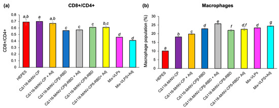 Mouse spleens collected one week after the second booster (week 9) were used to analyze the presence of cytotoxic T lymphocyte (CTL; CD3+ and CD8+) and T helper (Th; CD3+ and CD4+) cells. The highest percentage of CD3+CD4+ cell population was observed in the splenocytes isolated from the mice administered with the Mix-VLPs regardless of the presence of adjuvant, followed by those from the test groups inoculated with the VLPs of CΔ116-MrNV-CPβ-RBD and CΔ116-MrNV-CPδ-RBD with or without the adjuvant (Table 1). The negative control groups inoculated with CΔ116-MrNV-CP, regardless of the presence of adjuvant, also triggered proliferation of significantly high levels of CD3+CD4+ and CD3+CD8+ compared to the buffer-inoculated mice. Figure 5a shows that the CD8+/CD4+ T-cell ratio was significantly altered in the test groups immunized with the VLPs of CΔ116-MrNV-CPβ-RBD or CΔ116-MrNV-CPδ-RBD or the Mix-VLPs, with or without adjuvant, compared to the negative control groups. Additionally, high levels of macrophage population were also detected in animal groups immunized with the VLPs of CΔ116-MrNV-CPβ-RBD or CΔ116-MrNV-CPδ-RBD or the Mix-VLPs, with or without the adjuvant, whereas such macrophage elevation was not observed in the negative control groups (Figure 5b).