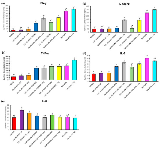 Multiplex quantification of cytokines in the sera of mice immunized with the chimeric VLPs. Different types of cytokines, (a) IFN-γ; (b) IL-12p70; (c) TNF-α; (d) IL-5; and (e) IL-6, collected from sera of the study groups, were quantitated. The negative groups were inoculated with HEPES buffer or the VLPs of CΔ116-MrNV-CP with and without the AddaVax adjuvant (Adj), while the test groups were inoculated with the VLPs of CΔ116-MrNV-CP displaying the β-SARS-CoV-2 RBD (CΔ116-MrNV-CPβ-RBD) and CΔ116-MrNV-CP displaying the δ-SARS-CoV-2 RBD (CΔ116-MrNV-CPδ-RBD) and a mixture of CΔ116-MrNV-CPβ-RBD and CΔ116-MrNV-CPδ-RBD (Mix-VLPs) with and without the AddaVax adjuvant. Statistical significance (p < 0.001) is denoted by italic letters shown above the bars. Insignificant differences are indicated by the same letter. The asterisks indicate significant difference (p < 0.001) by comparing the concentration of cytokines produced in the test groups with that from the mice immunized with Mix-VLPs supplemented with adjuvant. Standard deviations of triplicate measurements are shown by error bars.