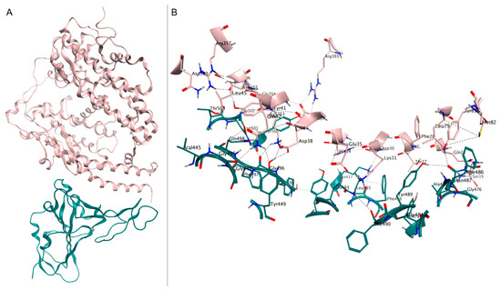 (A) Crystal structure of spike RBD (teal) in complex with hACE2 (pink), deposited in the Protein Data Bank with accession code 6M0J. (B) Close-up view of interface contacts between the spike RBD and hACE2: hydrogen bonds are represented as black dashed lines.