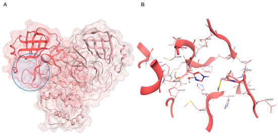 The S1 subunit comprises two main domains, specifically the N-terminal and C-terminal domains (NTD and CTD, respectively), which are both involved in the binding to host cell receptors [86]. The CTD contains the receptor-binding domain (RBD, residues 319–541), consisting of two motifs. Firstly, a core structure is formed by a twisted five-stranded antiparallel β sheet (β1, β2, β3, β4, and β7), with three short helices (α1, α2, and α3). Secondly, an extended loop (receptor binding motif, RBM) is formed by a two-stranded β sheet (β5 and β6), lying at one edge of the core and containing most of the residues involved in binding to hACE2 [87] (Figure 1).
