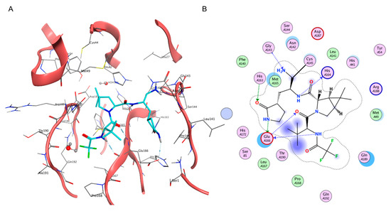 (A) Three-dimensional depiction of Nirmatrelvir orientation within the catalytic site of SARS-CoV-2 Mpro (PDB ID: 7RFW). (B) Bidimensional representation of intermolecular interactions of Nirmatrelvir–SARS-CoV-2 Mpro 7RFW complex.