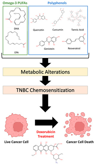 Rushing BR, Wiggs A, Molina S, Schroder M, Sumner S. Metabolomics Analysis Reveals Novel Targets of Chemosensitizing Polyphenols and Omega-3 Polyunsaturated Fatty Acids in Triple Negative Breast Cancer Cells. International Journal of Molecular Sciences. 2023; 24(5):4406. https://doi.org/10.3390/ijms24054406