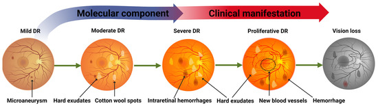 DR progression from mild to proliferative to vision loss. Also represented are the starting points and the increasing progression of the molecular and clinical components of DR with typical lesions.