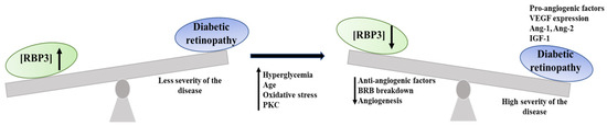 RBP3 has been implicated in several studies of DR [14,31,37], the latest of which clearly indicates a relationship between RBP3 levels in the retina (and vitreous) and the severity and progression of DR [30,37] (Figure 3). These observations are further supported by the fact that overexpression (or “injections” of externally produced RBP3) in rodents inhibited DR-related events [29,37]. The molecular mechanism underlying such observations seems to relate to the binding of the RBP3 antagonist to the glucose transporter 1 GLUT1 (present at outer segments and cell bodies of photoreceptors); as well as to RBP3 binding to the vascular endothelial growth factor (VEGF) receptor and inhibiting tyrosine phosphorylation [29,37]. The likelihood that such interactions decrease the retinal concentration of RBP3 link it to the progression of the disease [29,37].