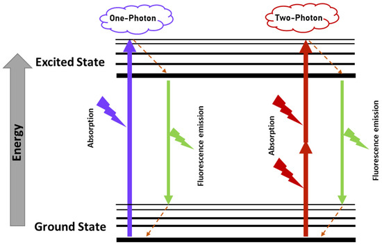 Two-photon excitation fluorescence microscopy is a variant of optical microscopy that offers several advantages compared to, for example, confocal, light-sheet, and super-resolution microscopy [41,42]. TPEF uses two near-infrared photons to achieve excitation (Figure 4), minimizing the autofluorescence generated by the imaged tissues, reducing photodamage, and achieving a greater penetrative power [42,43].