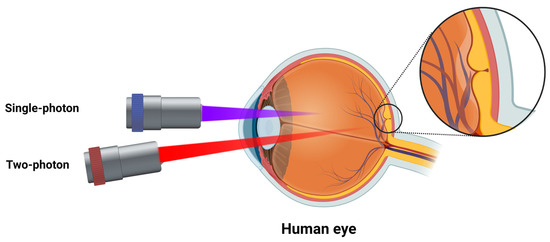Two-photon excitation fluorescence relies on the principle that two photons arrive at the same spot simultaneously, and that the recipient will experience an excitation of half the wavelength of the individual photons. Thus, one can achieve high energies by delivering a non-invasive, rather weak (but effective) laser beam in the infrared region [41,51,52]. This characteristic is particularly relevant for imaging of the eye, as intense high-energy wavelengths of light have detrimental effects and poorly penetrate the tissue, being absorbed by the anterior parts of the eye (sclera, cornea, lens) [53]. The penetration of light is further diminished in older people, making it even more difficult to use, as age is a major driver for pathological complications. Infrared light (IR) is much less affected by absorbance and scattering issues from biological materials, so better images are generated [29,51,53,160]. Another advantage of the two-photon method is the relatively large penetration power that allows the beam to cross the anterior part of the eye and the vitreous, and image the retina in the posterior part of the eye; the IR light beam keeps its shape through the ~250 μm retina thickness [51] (Figure 6). This advantage is particularly relevant in the context of DR, where the clinical and molecular manifestations occur in the retina and vasculature networks at the back of the eye. Currently, it is still not possible to acquire 3D volumes of the entire retina, but smaller 3D volumes enable imaging, for example, of ganglion cells and the IPM [51], or other subcellular localizations along the RPE thickness [52,53].
