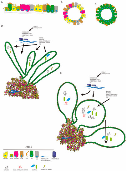 Illustrations of some examples of respiratory organoids that can be derived from PSCs. (A) Bidimensional arrays (2D minilungs) of both airways and lung epithelial cells derived from PSCs mounted on different substrates, such as human fibronectin. Tridimensional structures composed of cells of the airways (B) or the alveoli (C), derived from PSCs and embedded into biogels (e.g., MatrigelTm, etc.). “Lung buds” organoids [53] (D) or paddle-racquet lung organoids (PRLOs [55]) (E) composed of both airways and lung epithelial cells derived from PSCs. Proximal areas are mainly composed of cells from the airways with minor mesenchymal content. Distal areas represent the alveoli and are enriched in ATII cells, which may eventually undergo differentiation to ATI cells. These minilungs can be enriched with additional cell types, such as endothelial cells or fibroblasts and/or myofibroblasts from primary sources or the differentiation of PSCs. These minilungs can be used to model any respiratory disease or perform drug screening. Infection agents or genotoxic agents, such as bleomycin or liquid cigarette smoke, can be delivered into the lumen of the organoids by means of microinjections. RAS: respiratory airway secretory cells.