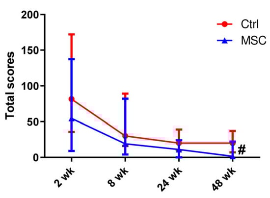 The total lung computed tomography (CT) scores in both groups decreased gradually from all assessment periods and became significantly different on week 48 (p < 0.05) (Figure 1). At the same time, every point differed from another inside each group. However, for the Control group, the total score did not change in the time period from 24 to 48 weeks, when this parameter decreased for the MSC group (Figure S1).