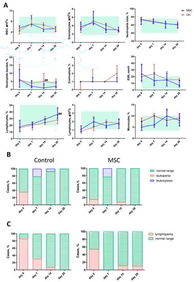 Dynamic changes in hematological parameters in patients with COVID-19. (A) The dynamic profile of blood cell types and ESR. A light green rectangle denotes the normal range. (B) The ratio of leukopenia and leukocytosis. (C) The ratio of lymphopenia. Data are presented as the median and interquartile range. Mann–Whitney U test for comparing the control and MSC groups at each time-point: ##, p ≤ 0.01. WBC, white blood cells; ESR, erythrocyte sedimentation rate. The red line represents the Control group; the blue line represents the MSC group.