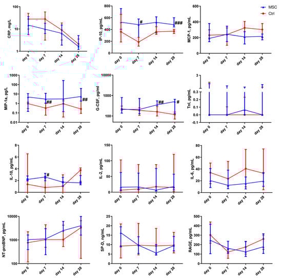 Dynamic changes in cytokine levels in patients with COVID-19. Data are presented as a median and interquartile range. Mann–Whitney U test for comparing the control and MSC groups at each time-point: #, p ≤ 0.05; ##, p ≤ 0.01; ###, p ≤ 0.001. The red line represents the Control group; the blue line represents the MSC group. CRP, C-reactive protein; IP-10, interferon gamma-induced protein 10; MCP-1, monocyte chemoattractant protein-1; MIP-1α, macrophage inflammatory protein-1 alpha; G-CSF, granulocyte colony-stimulating factor; IL-10, interleukin 10; IL-2, interleukin 2; IL-6, interleukin 6; NT-proBNP, N-terminal prohormone of brain natriuretic peptide; TnI, troponin I; SP-D, surfactant D; RAGE, receptor for advanced glycation endproducts.