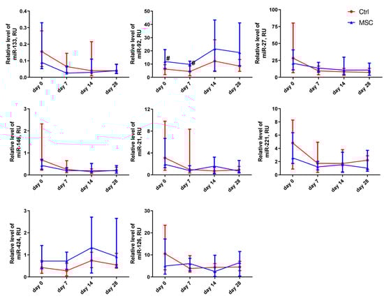Changes in the relative expression levels of miRNAs, depending on the time of assessment, are presented in Figure 4 and Figure S4. In the MSC group, the expression level of miR-27a-3p was significantly different on days 7 and 28 compared to the beginning of hospitalization. miR-146a-5p, miR-21-5p, and miR-221-3p decreased on days 7 and 28 in both groups compared with the beginning of hospitalization. For example, the relative expression level for miR-21-5p and miR-146a-5p decreased more than fourfold, and for miR-221-3p, it decreased more than threefold in the Control group but only twofold in the MSC group. On day 14 of observation, the relative expression level of miR-126-3p differed significantly from day 0 in the Control group, whereas in the MSC group, it did not change for 28 days. In the MSC group, the level of miR-133a-3p decreased threefold by day 7. The plasma levels of miR-92a-3p in patients of the Control group on days 0 and 7 of hospitalization were significantly lower compared to those in the MSC group. The expression levels of miR-92a-3p and miR-424-5p were elevated in both the Control and MSC groups over the observation period.