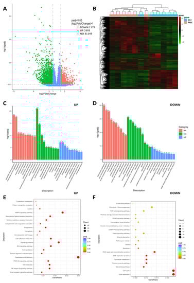 Transcriptome profile of COVID-19 patients-derived PBMC cultured with/without presence of UC-MSC. (A) Volcano plot for differentially expressed genes. (B) Heatmap represents numbers of differentially expressed genes between groups. (C,D) Gene Ontology representation analysis of the 2063 upregulated and 1433 downregulated genes. (E,F) KEGG annotation of differentially expressed genes. Experiments were performed in biological duplicate. The genes with padj < 0.05 were considered significant; log2Fold < 1, downregulated; log2Fold > 1, upregulated.