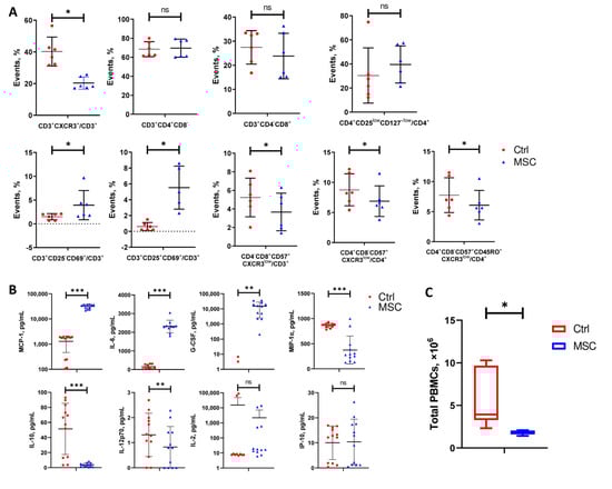 Changes in cell subpopulations’ ratios of COVID-19 patients-derived PBMC, cytokine levels in media, and total PBMC count after 6 days of co-culturing with or without UC-MSC. (A) Frequency of different T cells’ subpopulations. (B) Cytokine levels. (C) Difference between groups in total PBMC count collected from 6/24 wells. Data are presented as the mean with SD. Paired t-test was used for comparison between groups: *, p < 0.05; **, p ≤ 0.01; ***, p ≤ 0.001; ns, not significant. The red circle represents the Control PBMC group; the blue triangle represents the PBMC+UC-MSC group.