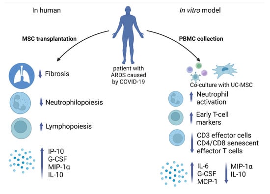 Immunomodulation effect of UC-MSC in vivo and in vitro. UC-MSC after transplantation in patients with ARDS caused by COVID-19 led to the reduction of lung tissue fibrosis and neutrophil count, stimulating lymphopoiesis and production of proinflammatory cytokines. In vitro model of PBMC co-culture with UC-MSC revealed abundance in neutrophil activation, early T-cell marker expression, and cytokine production, whereas counts of effector T cells and senescent effector CD4 and CD8 cells declined. Created with BioRender.com (accessed on 14 February 2023).