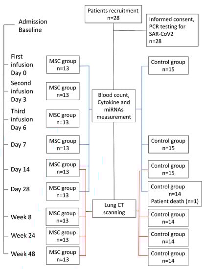 A total of 28 confirmed cases of patients with COVID-19 at the Kyiv City Clinical Hospital #4 were included in this single-center, non-randomized, open-label study registered on clinicaltrials.gov (NCT04461925) [89]. Fifteen patients who had undergone conventional treatment were enrolled in the Control group, and in the MSC group, there were thirteen patients who, in addition to conventional therapy, were treated with three consecutive doses of umbilical cord-derived MSC. Some underlining comorbidities and basic characteristics of both groups are indicated in Table 1. The study protocol was designed following the Declaration of Helsinki and approved by the ethics committee of Kyiv City Clinical Hospital #4 (protocol #280, 23 April 2020). All subjects enrolled in the study signed informed consent statements. All patients met the criteria for moderate COVID-19 severity according to the interim guidelines from the WHO and the Novel Coronavirus Pneumonia Diagnosis and Treatment Plan issued by the National Health Commission of the People’s Republic of China (Provisional 7th Edition) [90]. Patients from both groups had the following conditions: respiratory distress, RR ≥ 30 times/min, and oxygen saturation (SpO2) ≤ 93% at rest, and two-sided pneumonia was observed in all enrolled participants. Patients with severe COVID-19 symptoms persisting after 7–11 days of standard treatment participated in this study. The major treatments for patients included drug therapy, such as antibiotic therapy and standard treatment with dexamethasone to inhibit the inflammatory response. No mechanical ventilation was applied, but patients got oxygen through a facial mask if necessary. Data from each patient were collected for 28 days (Figure 8). Exclusion criteria included the following: shift to other treatment modalities (according to the treating physician), pregnancy, breastfeeding, malignant tumors, other systemic severe diseases, psychosis, enrollment in other clinical trials, co-infection of HIV or syphilis, inability to provide informed consent or to comply with test requirements, invasive ventilation lasting more than 48 h, and the presence of other organ failures (need for organ support).