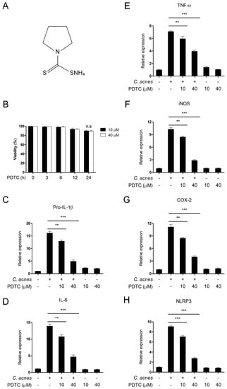 Inhibitory effects of PDTC on the C. acnes-induced inflammatory response. (A) Chemical structure of PDTC. (B) Mouse BMDMs were treated with 10 μM PDTC and 40 μM PDTC for the indicated times. The viability of cells was assessed by MTT assay. (C–H) Mouse BMDMs were pretreated with PDTC (10 μM and 40 μM) for 30 min and then incubated with heat-killed C. acnes (1 × 106 CFU/mL) for 6 h. The mRNA (pro-IL-1β, IL-6, TNF-α, iNOS, COX-2, and NLRP3) levels were measured using quantitative real-time PCR. The results are represented as the means ± SDs of three independent experiments. n.s, nonsignificant. ** p < 0.01. *** p < 0.001.