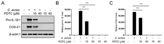 Inhibitory effects of PDTC on the expression of C. acnes-induced inflammatory proteins. Mouse BMDMs were pretreated with PDTC (10 and 40 μM) for 30 min and then incubated with heat-killed C. acnes (1 × 106 CFU/mL) for 6 h. Pro-IL-1β, COX-2, and β-actin protein levels were detected by Western blot analysis (A), and then the relative levels of protein bands were quantified (B,C). The results are represented as the means ± SDs of three independent experiments. *** p < 0.001.