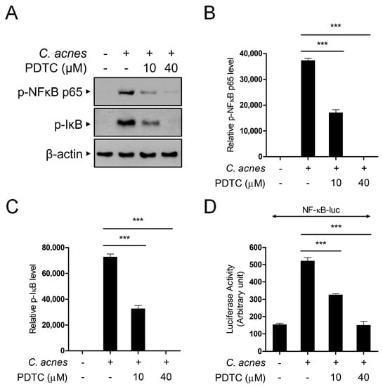 PDTC suppresses C. acnes-induced NF-κB transcriptional activation. (A–C) Mouse BMDMs were pretreated with PDTC (10 μM and 40 μM) for 30 min and then incubated with heat-killed C. acnes (1 × 106 CFU/mL) for 30 min. p-NF-κB (p65), p-IκB, and β-actin protein levels were detected by Western blot analysis (A), and then the relative levels of protein bands were quantified (B,C). (D) RAW264.7 cells were transfected with the NF-κB-luciferase reporter. After 24 h, the cells were pretreated with PDTC (10 μM and 40 μM) for 30 min and then incubated with heat-killed C. acnes (1 × 106 CFU/mL) for 6 h. The results are represented as the means ± SDs of three independent experiments. *** p < 0.001.