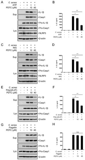 Inhibitory effects of PDTC on C. acnes-induced inflammasome activation. (A–D) Mouse BMDMs were primed with heat-killed C. acnes (1 × 106 CFU/mL) for 3 h and then treated with PDTC (10 μM and 40 μM) for 30 min before either ATP (5 mM) or nigericin (10 μM) incubation for 1 h. Culture supernatants (Sup) and cell lysates (Lys) were immunoblotted with anti-IL-1β, anti-caspase-1 and anti-NLRP3 antibodies (A,D). The secreted IL-1β level was measured using ELISA (B,C). (E–H) Mouse BMDMs were primed with heat-killed C. acnes (1 × 106 CFU/mL) for 3 h and then treated with PDTC (10 μM and 40 μM) for 30 min before poly (dA:dT) (10 μg/mL) transfection with lipofectamine 3000 or flagellin treatment (5 μg/mL) for 4 h. Culture supernatants (Sup) and cell lyastes (Lys) were immunoblotted with the indicated antibodies (E,G). The secreted IL-1β level was measured using ELISA (F,H). The results are represented as the means ± SDs of three independent experiments. * p < 0.05, ** p < 0.01, *** p < 0.001; n.s, nonsignificant.