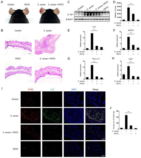 C57BL/6 mice were purchased from Orient Bio Inc. (Seongnam, Republic of Korea) and bred at the Animal Laboratory Center of Kangwon National University. All experiments were approved by the Institutional Animal Care and Use Committee (IACUC, KW-201026-1, Kangwon National University, Republic of Korea). Mice (three per group) were injected with live C. acnes (1 × 108 CFU per 20 μL in PBS) into the ears with or without PDTC (100 mg/kg). After 24 h, mice were sacrificed, and ear tissues were then collected for further analysis. For the immunofluorescence analysis, tissue sections were deparaffinized and blocked with 5% bovine serum albumin (BSA) for 30 min. Sections were then incubated with the phycoerythrin (PE)-conjugated anti-mouse F4/80 antibody (1:400) and anti-IL-6 antibody (1:500) overnight. After incubation with FITC-conjugated anti-rabbit IgG antibody (1:400) and 40,6-diamidino-2-phenylindole (DAPI) for 1 h, tissue sections were mounted in mounting medium (Abcam, Cambridge, MA, USA), and the image was analyzed using fluorescence microscopy.
