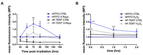 Comparing the different cell lines under the same treatment, it is possible to note that HFFF2 cells showed slower growth rates than HF-TERT after X-rays, differentially of hydrogen peroxide treatment in which there is no differences after treatment (Figure S2C,D).