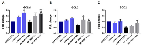 Expression level of GCLM, GCLC and SOD2 genes. RT-qPCR of GLCM (A), GCLC (B) and SOD2 (C) in untreated and treated normal and hTERT-overexpressing cells after 1 and 3 h of recovery. The values are normalized to the control HFFF2 cells and are expressed as mean values ± SEM. Statistical analysis (*) is performed between each sample and control HFFF2 cells (* p < 0.05; ** p < 0.01; *** p < 0.001; t-test), or between treated and untreated HF-TERT cells (# p < 0.05; ### p < 0.001; t-test).