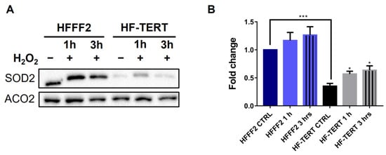 SOD2 protein level evaluated after H2O2 treatment. (A) Western blot of SOD2 and Aconitase 2 (ACO2, used as a control) in HFFF2 and HF-TERT cells at 1 or 3 h of recovery after H2O2 treatment. (B) Quantification of SOD2 protein level in both cell lines after H2O2 treatment. Data represent mean ± SEM. Statistical analysis is performed between HF-TERT and HFFF2 untreated cells, or between treated and untreated HF-TERT. * p < 0.05; *** p < 0.001 by t-test.
