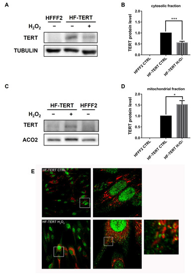 TERT localization in mitochondrial and cytosolic fraction. (A) Representative Western blot shows specific bands for cytosolic level of TERT and tubulin, used as control protein, in untreated and treated HFFF2 or HF-TERT cells. (B) Level of TERT protein in cytosol after 3 h of H2O2 treatment, normalized to tubulin signal. (C) Representative Western blot of mitochondrial level of TERT and ACO2, used as control protein, in untreated HFFF2 and in untreated and treated HF-TERT cells 3 h after treatment. (D) Quantification of mitochondrial level of TERT protein, normalized to ACO2 signal. (E) Image of cells stained for TERT antibody (green) and Mitospy (red) in untreated (upper panel) and treated (lower panel) HF-TERT cells. The enlarged images show localization of TERT protein into mitochondria. Data represent mean ± SEM. * p < 0.05; *** p < 0.001; by t-test.