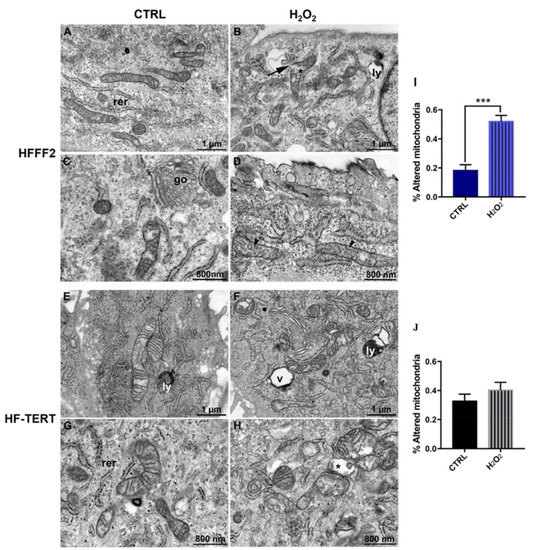 FIB/SEM micrographs illustrating mitochondrial morphology in HFFF2 (A–D) and HF-TERT (E–H) cells, treated and untreated with H2O2. In untreated cells, mitochondria display a typically elongated shape and numerous parallel-oriented cristae. Following treatment, mitochondrial swelling (asterisks), with matrix expansion and cristae dysmorphic features, including numerical reduction, spatial disorganization and/or fragmentation (arrowheads) are observed. Rupture of the outer membrane is occasionally found (arrow). The diagrams report mitochondria alteration in untreated and treated (I) HFFF2 cells and (J) HF-TERT cells after 3-hour recovery. Data represent mean ± SEM. *** p < 0.001; by Student’s t-test. Acronyms: (go) Golgi complex, (ly) lysosome, (rer) rough endoplasmic reticulum, (v) vacuole.