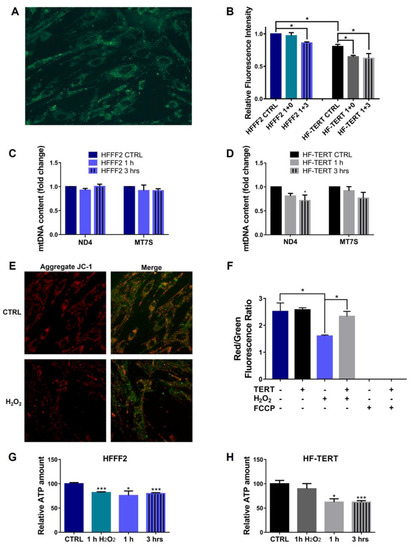 Mitochondrial function and amount in untreated and treated HFFF2 and HF-TERT. (A) Representative image of HFFF2 cells stained with MitoTracker Green. (B) Mitochondrial mass in untreated and treated HFFF2 cells and HF-TERT cells immediately after 1 h, after 1 and 3 h of recovery from H2O2 treatment. (C,D) qPCR for ND4 and MT-7S mitochondrial genes in untreated and treated HFFF2 (C) and HF-TERT cells (D) after 1 and 3 h of recovery. (E) Mitochondrial membrane potential (ΔΨm) measured by JC-1, red to green fluorescence intensity ratio. (F) Quantification data of JC-1 after 1 h of H2O2. FCCP (10 μM) is used as the positive control. ATP level in untreated and treated HFFF2 (G) and HF-TERT (H) cells. All values are expressed as mean values ± SEM. Statistical analysis is performed between treated and control samples of both cells. * p < 0.05; *** p < 0.001; by t-test.