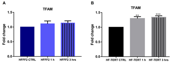 Mitochondrial transcription factor A (TFAM) is a member of the high-mobility group (HMG) [52], able to directly bind mtDNA, but it is also involved in many functions such as helping mitochondrial DNA in transcription and replication [53,54]. As a possible indication of the modulation of this process, we analyzed the expression of the TFAM gene in HFFF2 and HF-TERT cells at 1 and 3 h after H2O2 treatment. Even though in normal fibroblasts we observed a slight not significant increase in the TFAM expression after treatment (Figure 9A), only in HF-TERT cells, TFAM gene showed a significantly increased expression at both times analyzed (Figure 9B) suggesting likely different regulation of mtDNA functions.