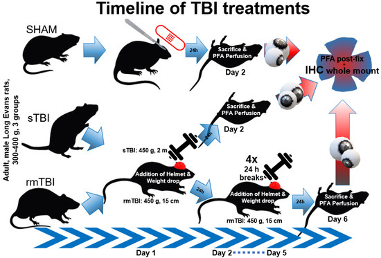 - Tadepalli, S.A.; Bali, Z.K.; Bruszt, N.; Nagy, L.V.; Amrein, K.; Fazekas, B.; Büki, A.; Czeiter, E.; Hernádi, I. Long-Term Cognitive Impairment without Diffuse Axonal Injury Following Repetitive Mild Traumatic Brain Injury in Rats. Behav. Brain Res. 2020, 378, 112268. [Google Scholar] [CrossRef] [PubMed]