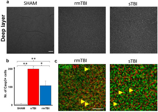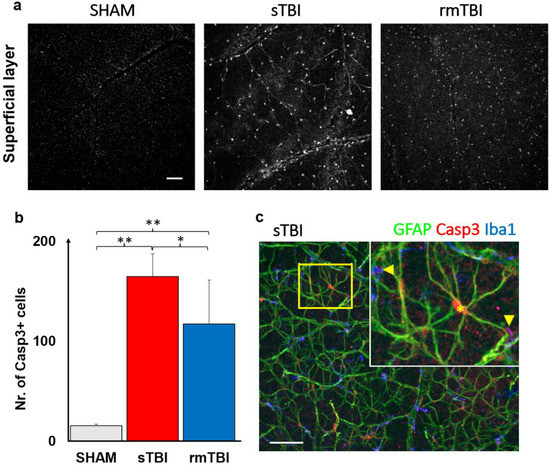 - Glushakov, A.O.; Glushakova, O.Y.; Korol, T.Y.; Acosta, S.A.; Borlongan, C.V.; Valadka, A.B.; Hayes, R.L.; Glushakov, A.V. Chronic Upregulation of Cleaved-Caspase-3 Associated with Chronic Myelin Pathology and Microvascular Reorganization in the Thalamus after Traumatic Brain Injury in Rats. Int. J. Mol. Sci. 2018, 19, 3151. [Google Scholar] [CrossRef] [PubMed]