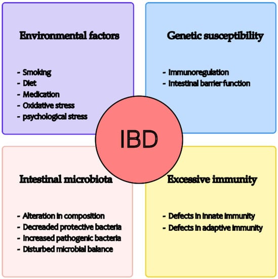 Recent studies have shown that the pathogenesis of IBD is related to environmental factors, gut microbiota, excess immunity, and genetic susceptibility (see Figure 1) [6]. With regard to the environment, studies have shown that a diet rich in fruit and vegetables is associated with a reduced risk of Crohn’s disease [7], while the consumption of fast foods high in sugar and fat may worsen the onset of the disease [8]. In addition, smoking, medication, and oxidative and psychological stress may influence the development of IBD [9,10,11]. Second, some studies have shown that the gut microbiota of IBD patients is significantly different from that of healthy individuals, such as altered composition, decreased protective bacteria, increased pathogenic bacteria, and disturbed microbial balance. These changes, in turn, may influence the progression of IBD [12,13,14]. Thirdly, the intestinal immune system comprises innate and adaptive immunity. Innate immunity includes various aspects such as the protective barrier function of the intestinal mucosa, antibacterial proteins, gastric acid and immune cells, and innate cytokines and molecules. On the other hand, adaptive immunity, involving T and B cells, is pathogen-specific and is typically triggered when the innate immune system fails to respond effectively to a pathogen [15]. Regulation of the immune response to the gut microbiota is critical in maintaining the balance between immune tolerance and defensive inflammation, and any disruption can lead to excessive immunity, triggering the onset of IBD [16]. Genetic susceptibility has been demonstrated in IBD patients [17]. Investigation of the genes and genetic loci involved in IBD has shown that several key processes are critical for maintaining intestinal stability, such as epithelial barrier function, immune regulation, and so on. A disrupted epithelial barrier can allow microbial invasion, which is then recognised by the innate immune system, leading to the initiation of appropriate responses, such as tolerogenic, inflammatory, and restorative responses, in part through the secretion of extracellular mediators that attract T and B cells [18]. Nevertheless, the precise cause of IBD remains unclear [6].