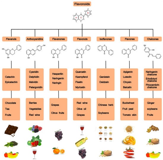 Flavonoids are a large family of polyphenolic plant compounds. Flavonoids have a three-ring basic structure consisting of two benzene rings linked by a pyran heterocyclic ring. Based on structural differences, flavonoids are mainly divided into seven subsets, namely flavonols, flavanones, isoflavones, anthocyanidins, flavanols, flavones, and chalcones (see Figure 2). To date, scientists have discovered over 5000 different flavonoids from different plants [31].