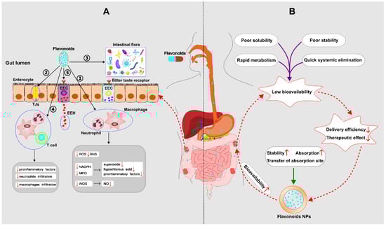 (A) Mechanisms by which flavonoids regulate IBD––① Antioxidant property; ② Preservation of the impaired epithelial barrier: flavonoids have the ability to increase mucus, improve tight junctions (TJs) and the ultrastructure of the intestinal mucosa; ③ Shaping of the intestinal microbiota: Flavonoids are able to restore the damaged microbial diversity, increase the number of anti-inflammatory bacteria, and inhibit the translocation of harmful bacteria; ④ Immunomodulatory function; ⑤ Modulation of the enteroendocrine system: flavonoids can stimulate the synthesis and release of enteroendocrine hormones (EEH) resulting from enteroendocrine cell (EEC), which produces a beneficial effect on IBD. (B) Mechanisms of nanoparticles (NPs) to improve the bioavailability of flavonoids. (ROS: reactive oxygen species; RNS: reactive nitrogen species; NADPH: nicotinamide adenine dinucleotide phosphate; MPO: myeloperoxidase; iNOS: inducible nitric oxide synthase; NO: nitric oxide;